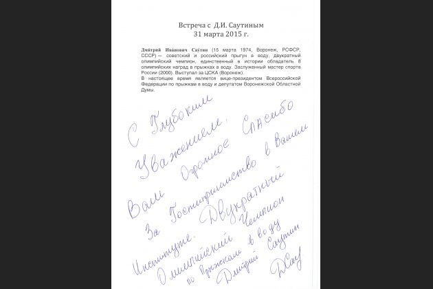 31 марта в ВИВТ состоялась встреча с двукратным олимпийским чемпионом по прыжкам в воду, единственным обладателем медалей во всех 4 видах современной прыжковой программы на Олимпийских играх, почетным гражданином Воронежа Дмитрием Ивановичем Саутиным. Дмитрий Иванович поделился со студентами своей историей успеха. Олимпийскому чемпиону было задано много вопросов, на которые он с удовольствием ответил. Все желающие смогли сделать памятное фото и получить автограф известного спортсмена. И по традиции Дмитрий Саутин, как почетный гость, оставил автограф в памятной книге института.