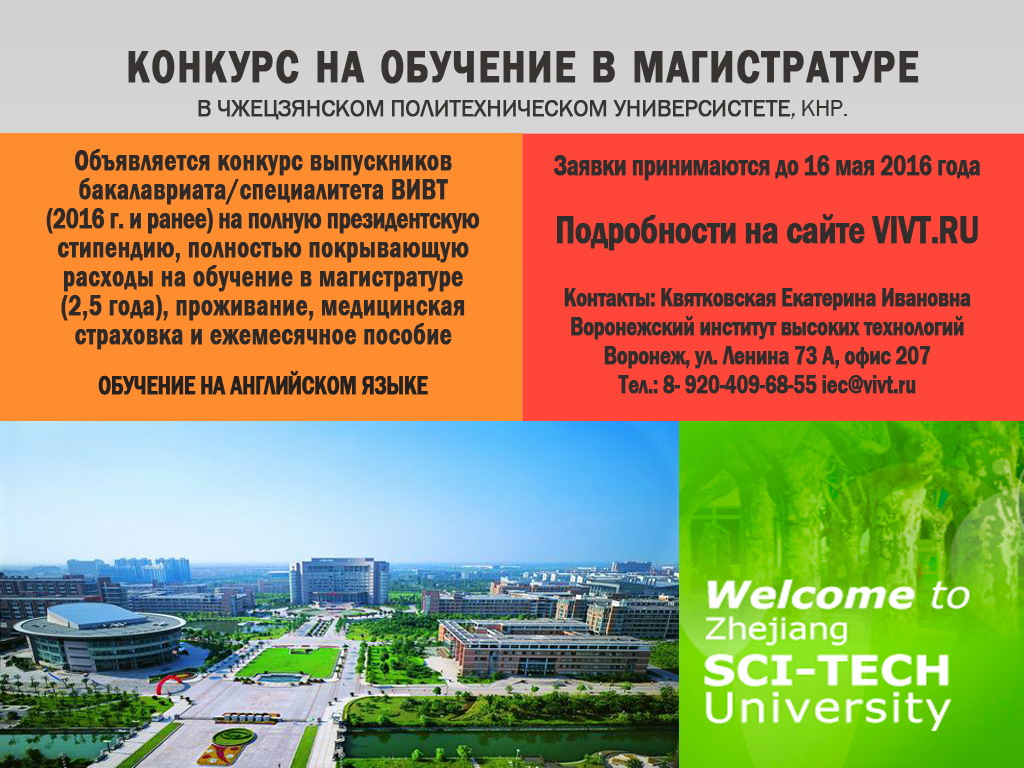 Волонтеры ВИВТ и Центр гражданской взаимопомощи в Воронеже готовятся принять участие в Форуме Большого совета НКО Воронежской области, который пройдет в конце апреля. На одной из площадок планируется подведение итогов и награждение победителей турнира по решению кейсов социальных проблем «Социальный патруль», организованный ВИВТ и ЦГВ при поддержке экспертов КГИ.Объявляется конкурс выпускников бакалавриата/специалитета ВИВТ (2016 года и ранее) на полную президентскую стипендию, полностью покрывающую расходы на обучение в магистратуре (2,5 года), проживание, мед.страховка и ежемесячное пособие в Чжэцзянском политехническом университете, КНР. Обучение на английском языке.